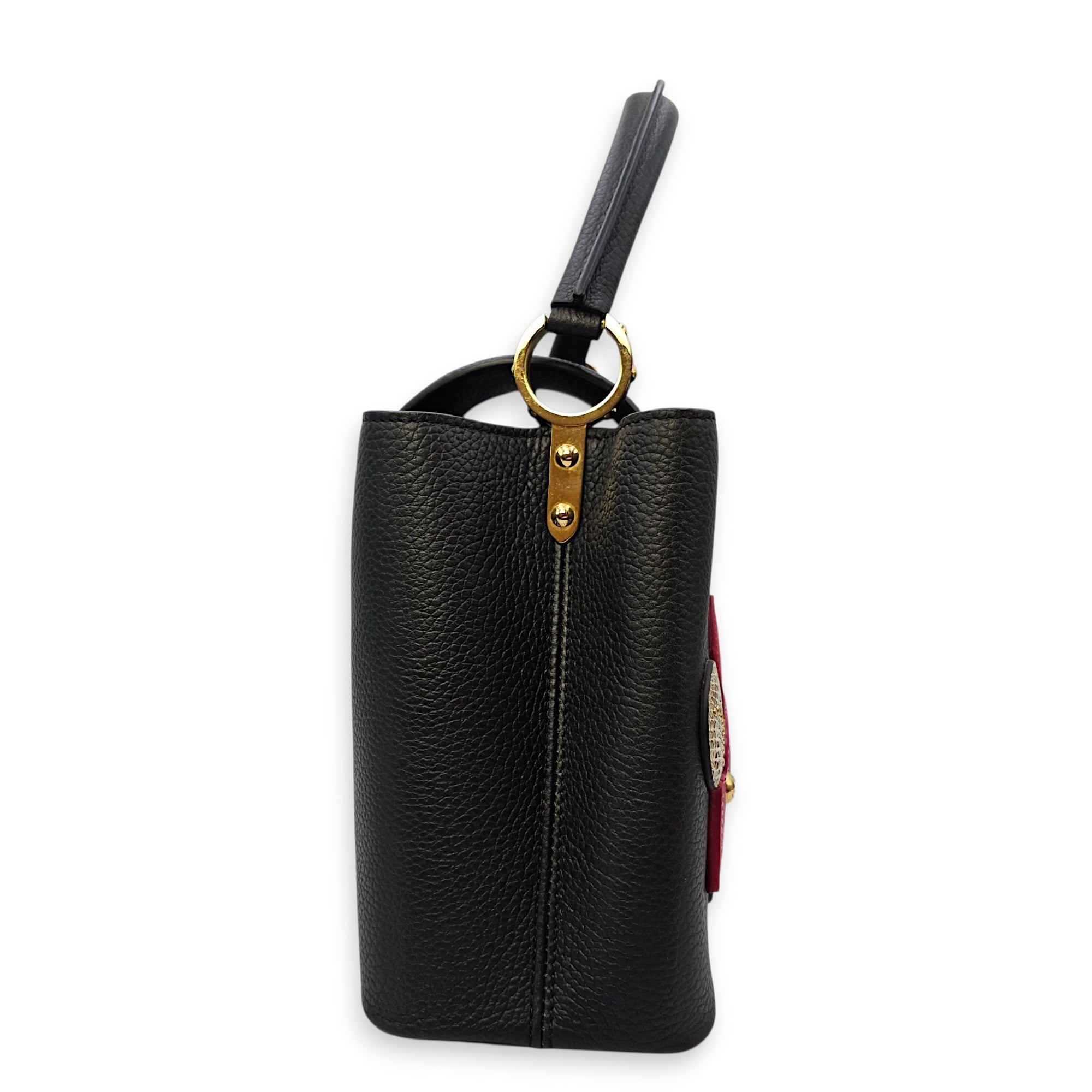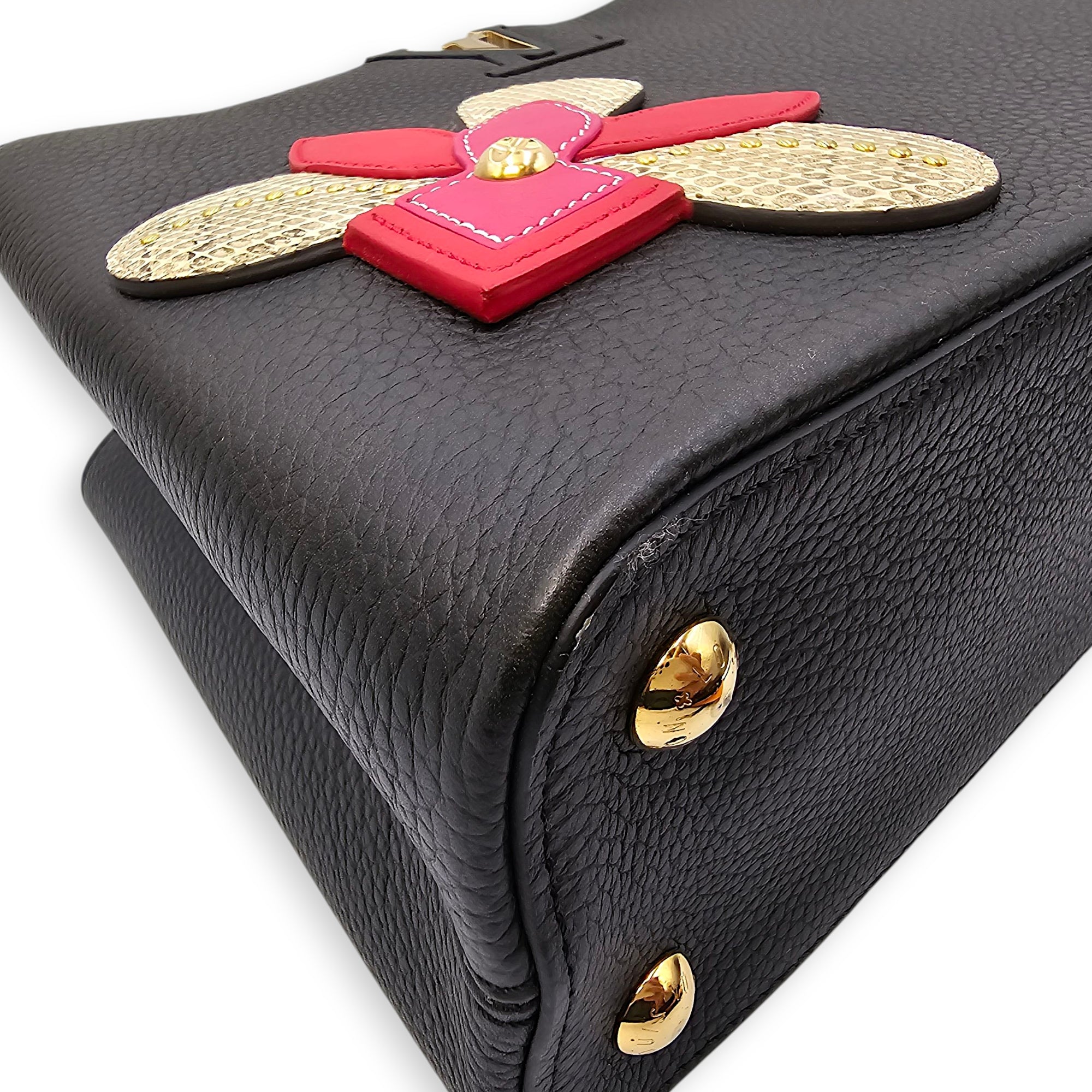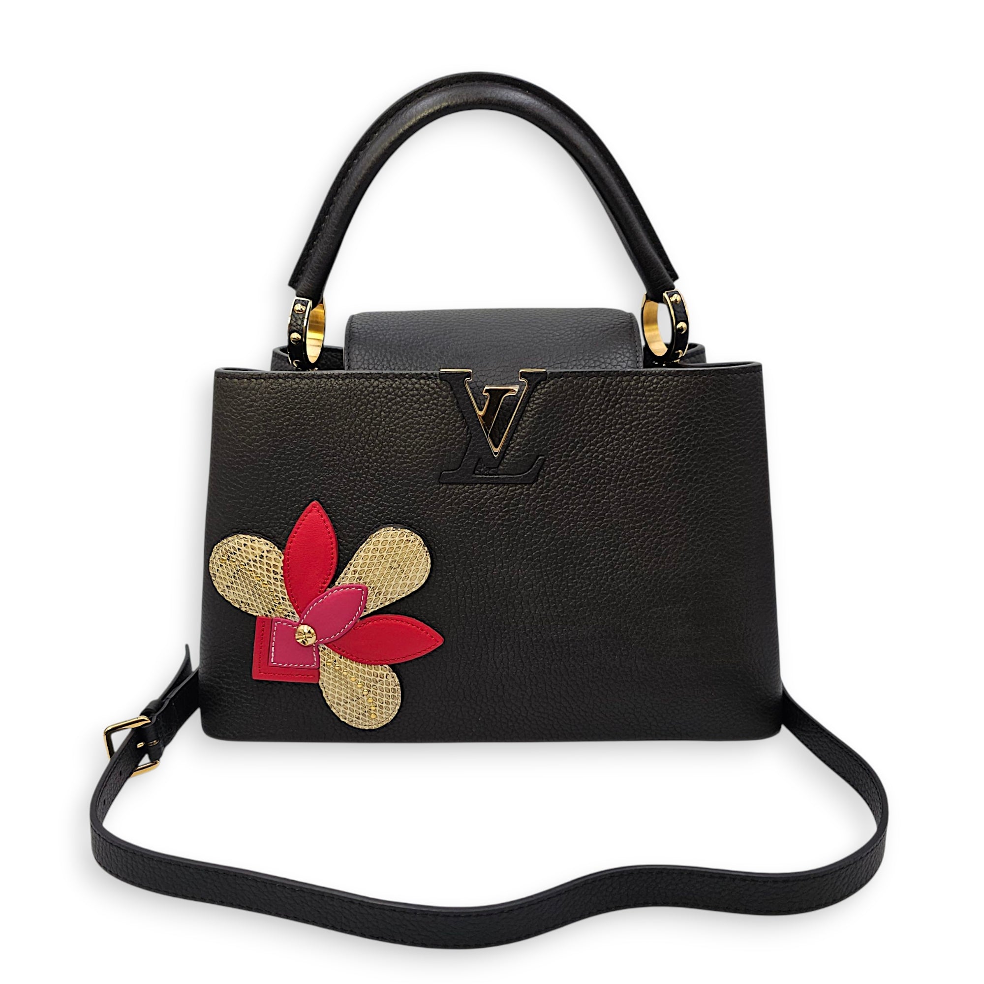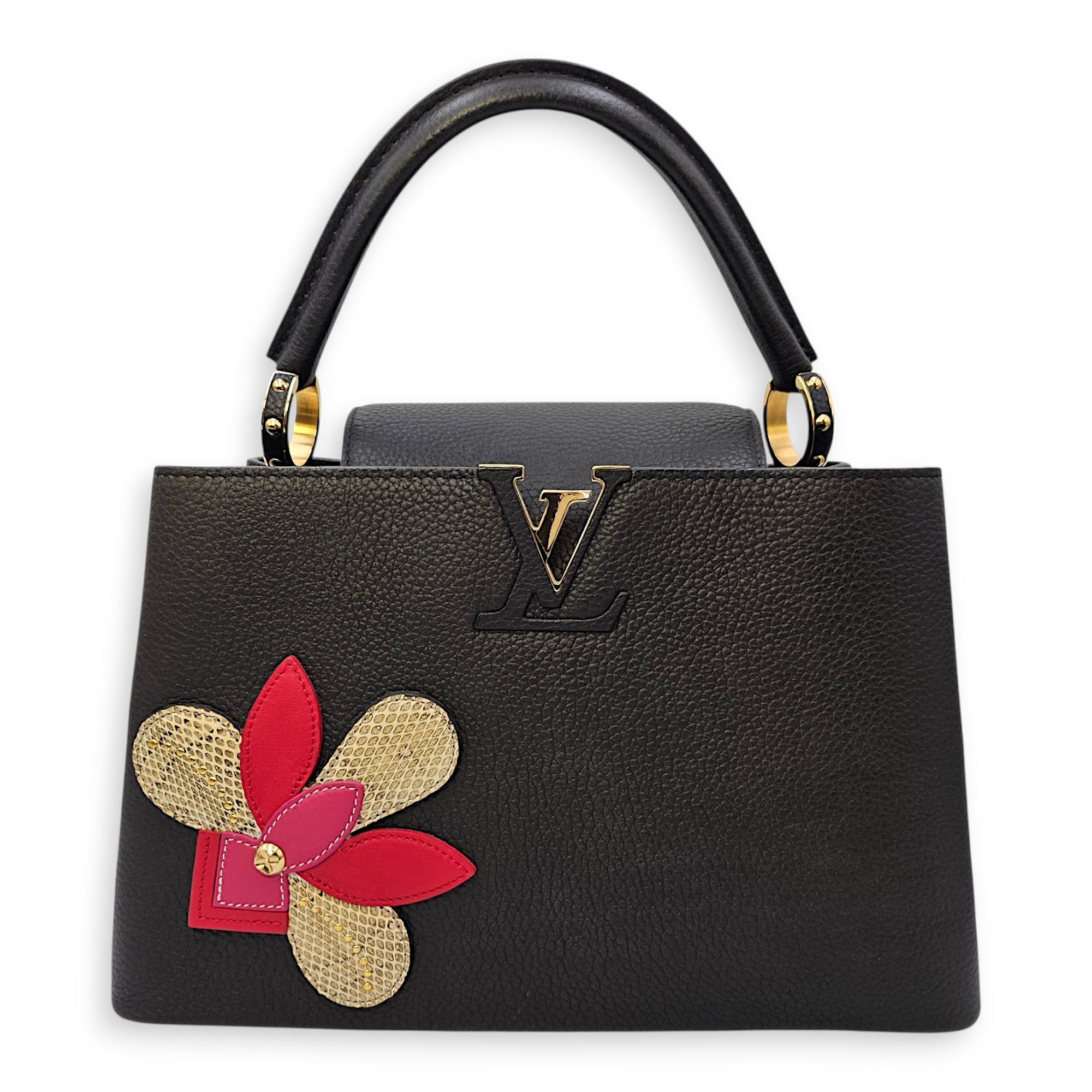 Capucines Iris Blossom PM Black Top Handle Bag in Calfskin, Gold hardware
