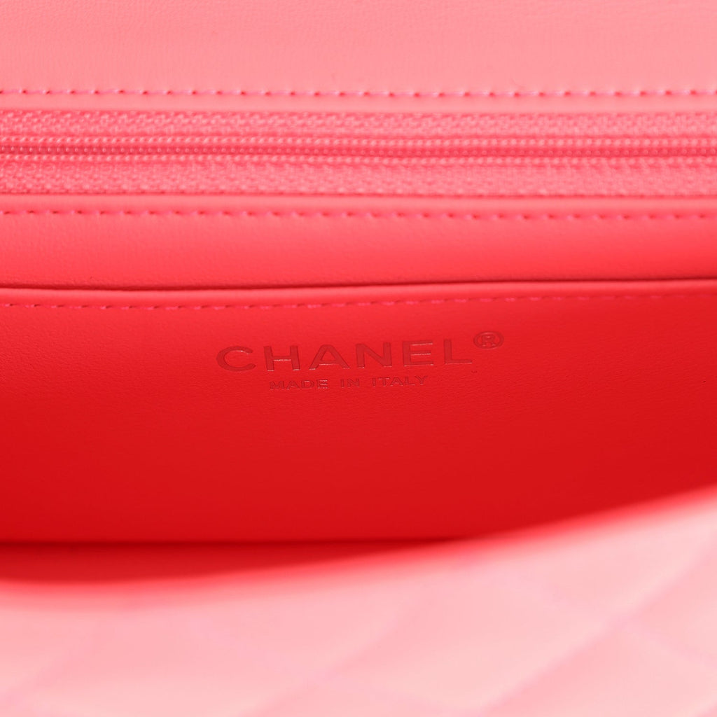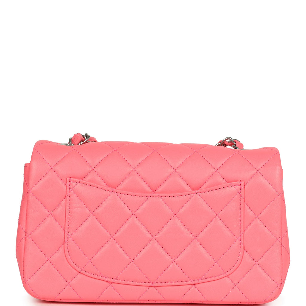 Chanel Mini Rectangular Flap Bag Pink Lambskin Silver Hardware Shop for an authentic Chanel Mini Rectangular Flap in pink lambskin leather with silver tone hardware in new and never worn condition at Madison Avenue Couture.