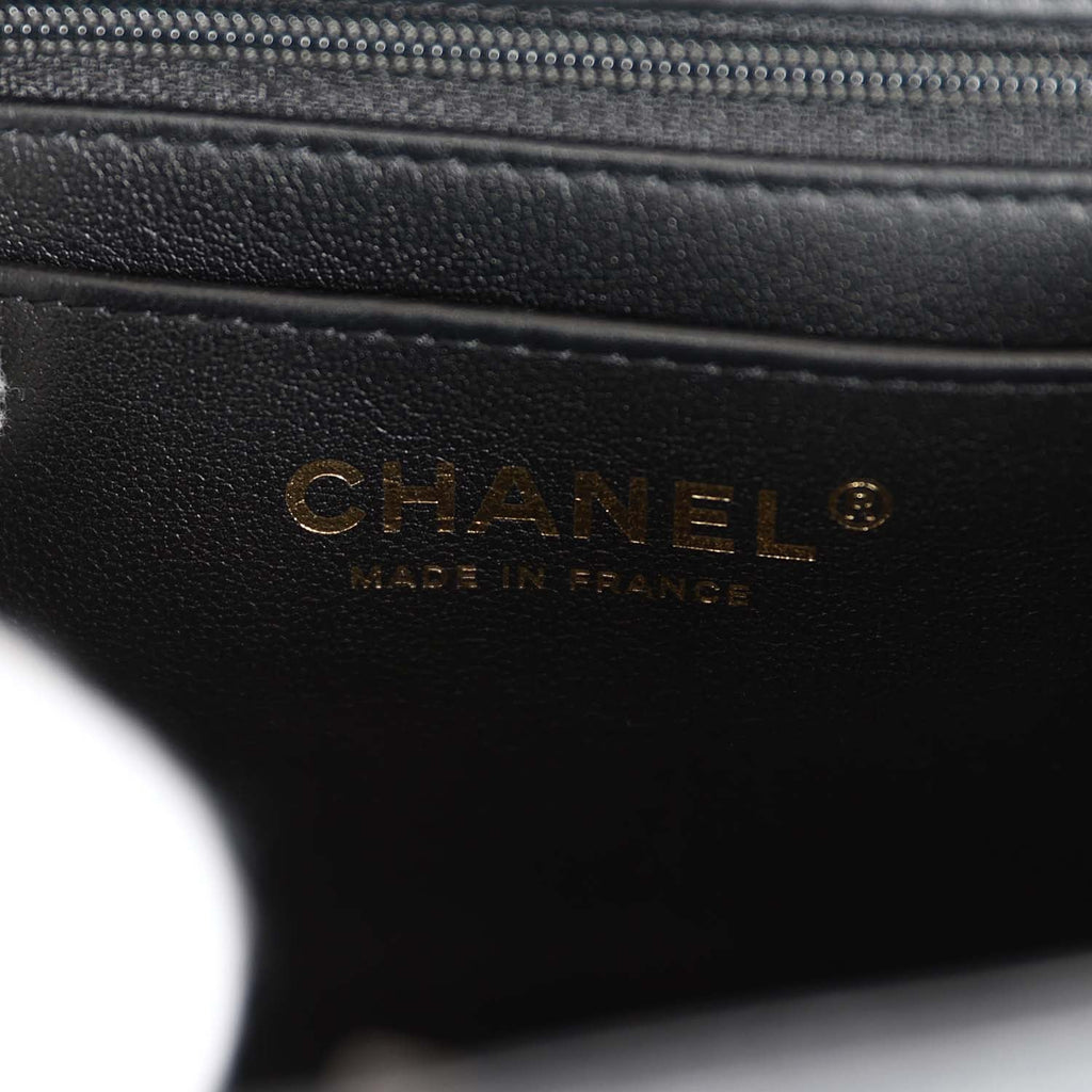 This Mini Flap bag is in black lambskin leather with light gold tone hardware and features a front flap with CC turnlock closure, back half moon pocket and adjustable interwoven light gold tone chain link shoulder/crossbody strap with charm attachment.The interior is lined in light black leather and features a small zip pocket with Chanel pull and slip pocket underneath on the rear wall.Collection: 23C (RFID Chip)Origin: ItalyCondition: New and never worn Accompanied by: Chanel box (damaged box), Chanel dustbag, RFID chip and FeltMeasurements: 6.2″ width x 5″ height x 3″ depth; 20″ strap drop