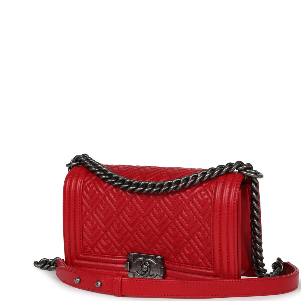 This Chanel Old Medium Boy Bag is in red lambskin leather with aged ruthenium hardware, featuring tonal stitching, geometric quilt printed leather, front flap with Le Boy CC push closure, smooth leather trim, and aged ruthenium chainlink and leather shoulder strap.The interior is lined in red grossgrain fabric and has one slit pocket on rear wall.Collection: 21-series (2015-2016)Origin: FranceCondition: Never wornAccompanied by: Chanel box, Chanel dustbag, felt, carebook, COA CardMeasurements: 9.8″ width x 5.9″ height x 3.5″ depth; 22″ strap drop (12″ doubled)