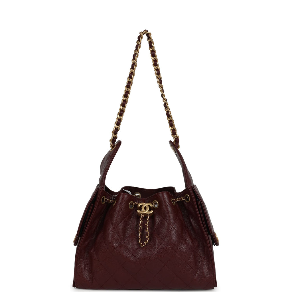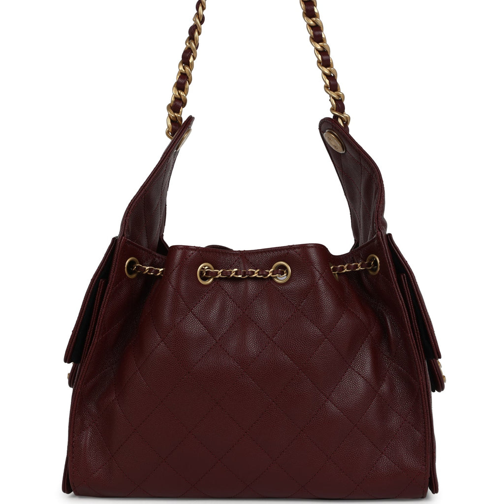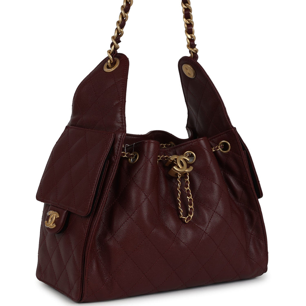 Chanel Small 25 Hobo Bag Burgundy Caviar Antique Gold Hardware Shop for an authentic Chanel Small 25 Hobo Bag in burgundy caviar with antique gold hardware in new and never worn condition at Madison Avenue Couture.