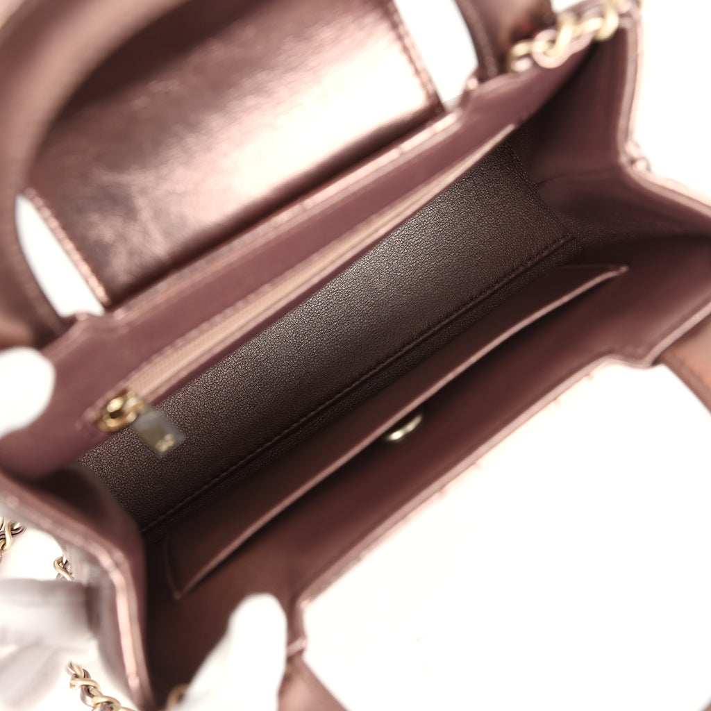 This small Kelly Shopper is in metallic bronze calfskin leather with brushed gold hardware, tonal stitching, two flat back top handles and a chain strap interwoven with leather, tab flap with CC turn-lock acts as a closure.The interior is lined with metallic bronze leather and has one zipper and one slip pocket.Collection: 25A (RFID chip)Origin: ItalyCondition: New and never worn (plastic on hardware) Accompanied by: Chanel box (minor splitting to the lid), Chanel dustbag, RFID chip, retail UPCMeasurements: 7.75″ width x 5″ height x 2.5″ depth; 2.5″ handle drop 23″ strap drop