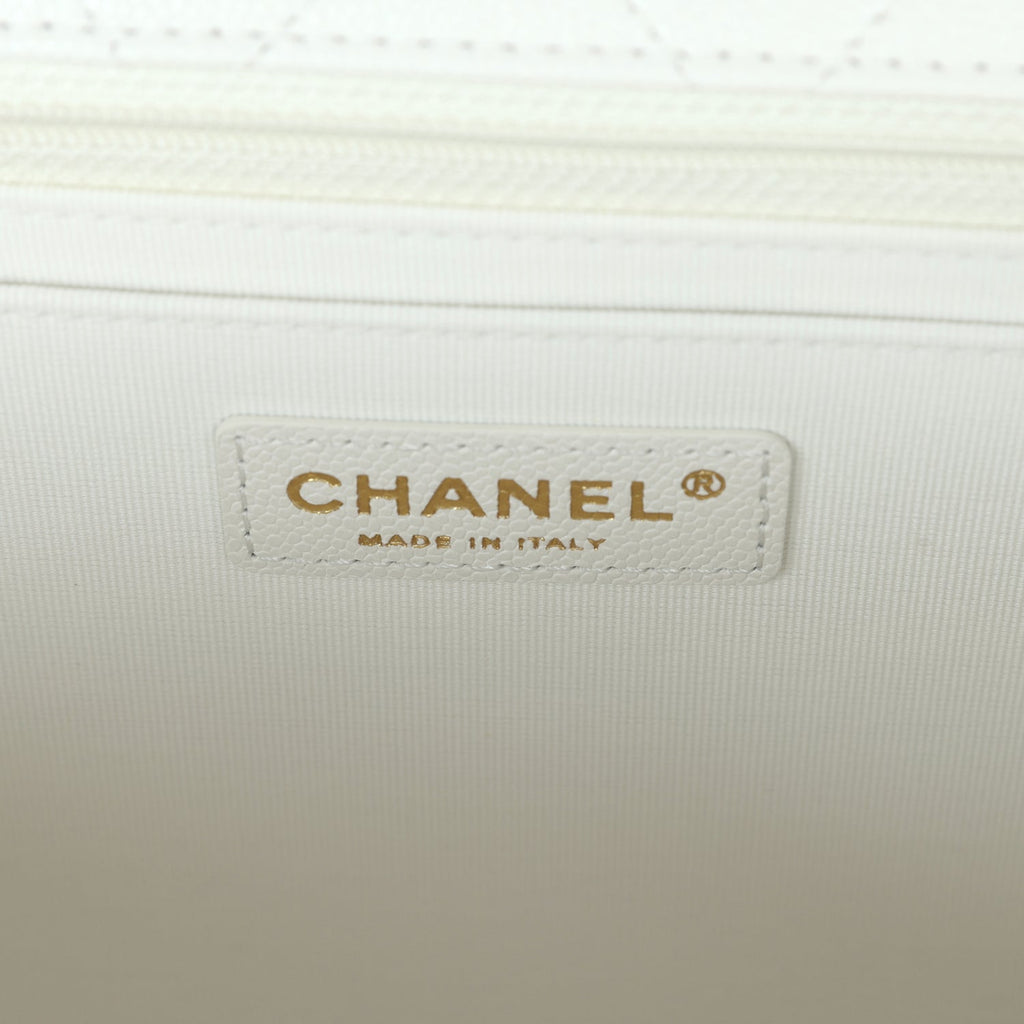 This XXL flap bag is in white shiny caviar with light gold tone hardware and has a front flap with signature CC turnlock closure, rear slip pocket and interwoven white leather and light gold tone chain link shoulder straps.The interior is lined in white canvas and features a zipper pocket with Chanel pull and an open pocket below.Collection: 24COrigin: ItalyCondition: New and never wornAccompanied by: Chanel box, Chanel dustbag, carebook, felt and retail UPCMeasurements: 16″ width x 10″ depth x 4.5″ height; 20″ strap drop (11.5″ doubled)