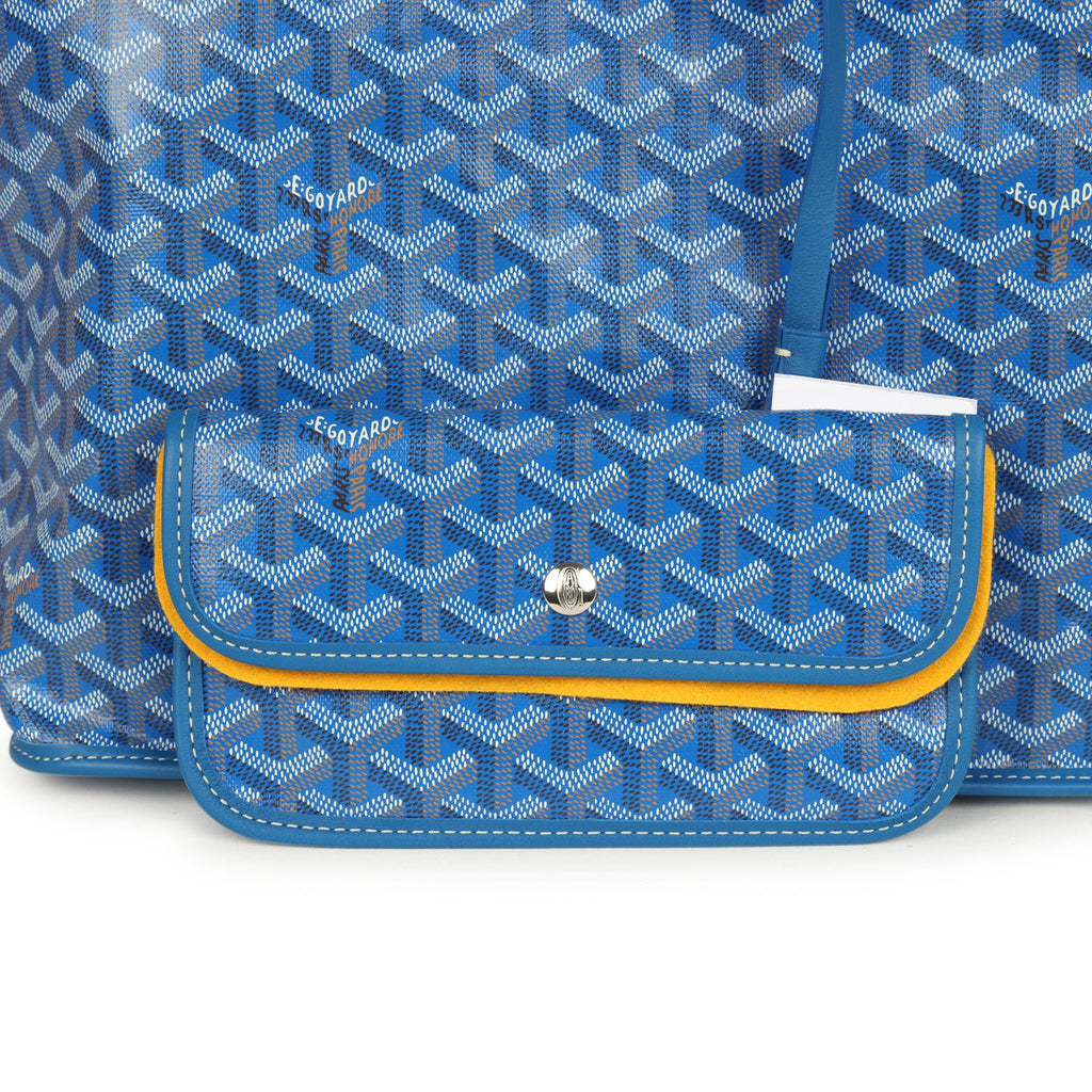 This Goyard Anjou PM Tote is of Sky Blue Chevroches calfskin leather and Goyardine coated canvas leather with palladium hardware, contrast stitching, a reversible tote, and a detachable matching coin purse.Origin: FranceCondition: New and never worn (plastic on handles)Accompanied by: Goyard dustbag, felt, retail UPC, removable pouch, carebookMeasurements: 18.5″ x 11″ x 5.9″;  handle: 7.5″
