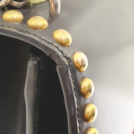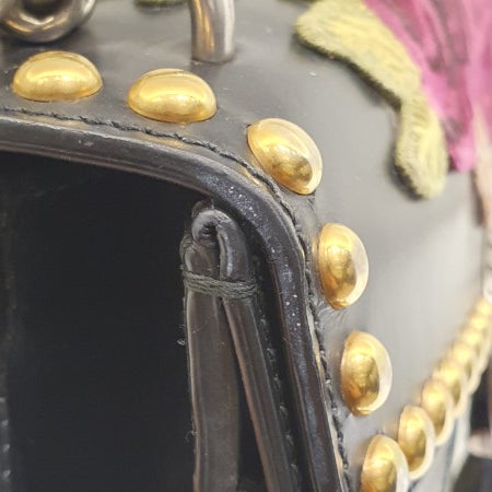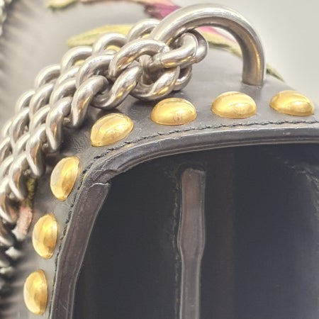 • Material: Black Calfskin Leather with Multicolor Embroidered Flower Details and Studs
