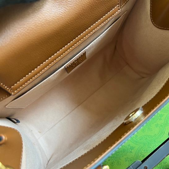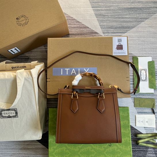 Gucci Diana medium top handle bag Brown leather has an interior open pocket and two zip compartments. Detachable and adjustable shoulder strap with 23.6″ drop