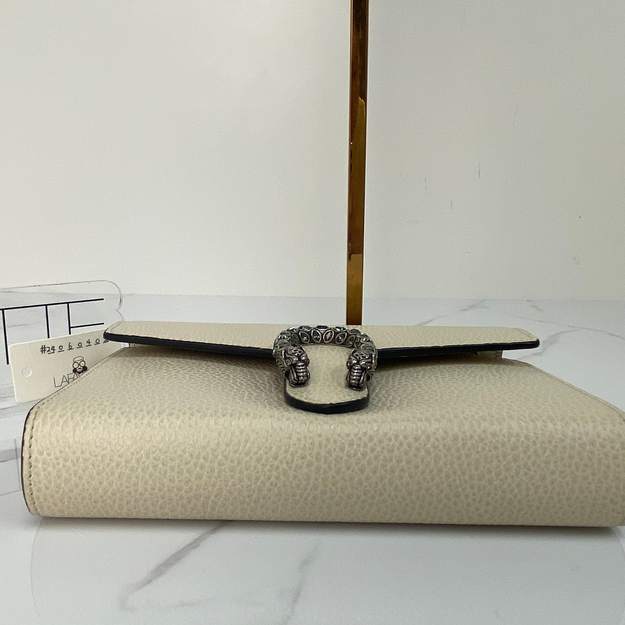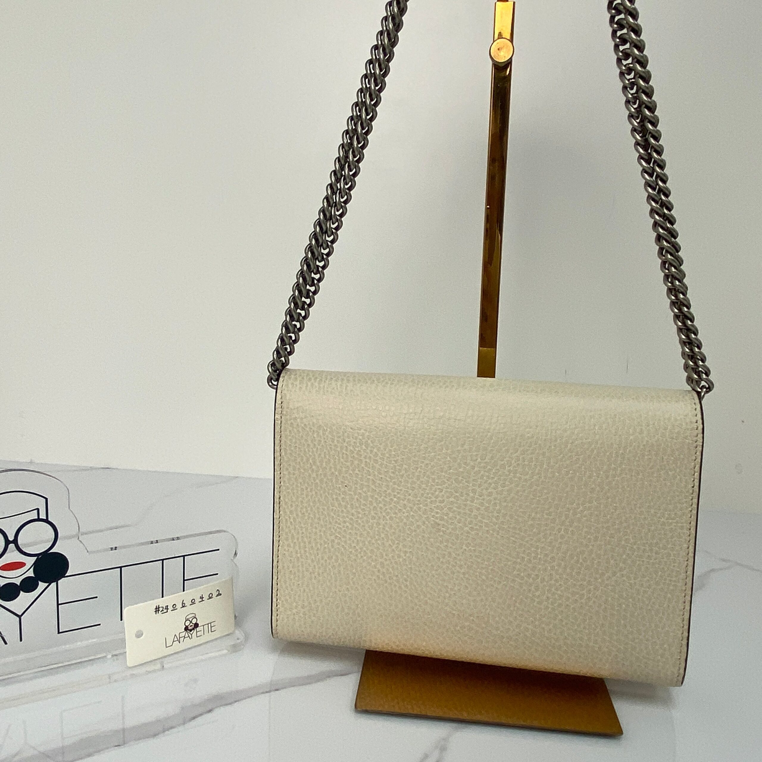 Step into the spotlight with the Gucci Dionysus Mini Leather Chain Wallet, a stunning piece crafted from luxurious white calfskin. This little gem combines elegance with an edgy twist, thanks to its signature tiger head clasp. Perfectly petite and undeniably chic, it’s like carrying a touch of Greek mythology and modern glam all in one!