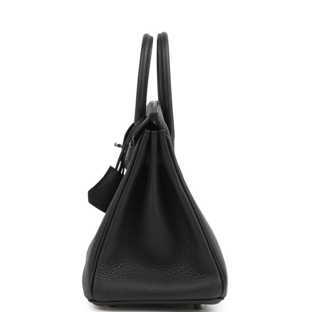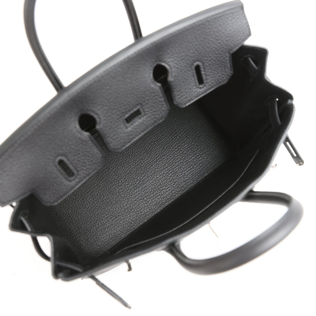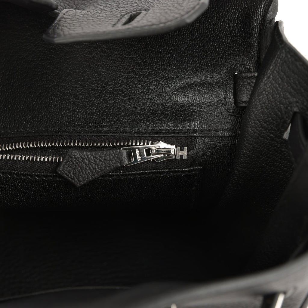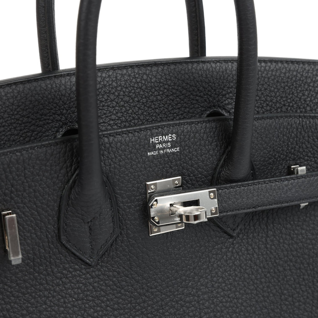 This Birkin is in Black togo leather with palladium hardware, has tonal stitching, front flap, two straps with center toggle closure, clochette with lock and two keys, and double rolled handles.The interior is lined with Black chevre leather and has a zip pocket with an Hermes engraved zipper pull and an open pocket on the opposite side.Collection: K (2025)Origin: FranceCondition: New and never worn (plastic on hardware)Accompanied by: Hermes box, Hermes dustbag, felt, clochette, lock, two keys, clochette dustbag, carebook, ribbonMeasurements: 10″ width x 7.5″ height x 4.75″ depth; 2.75″ handle drop