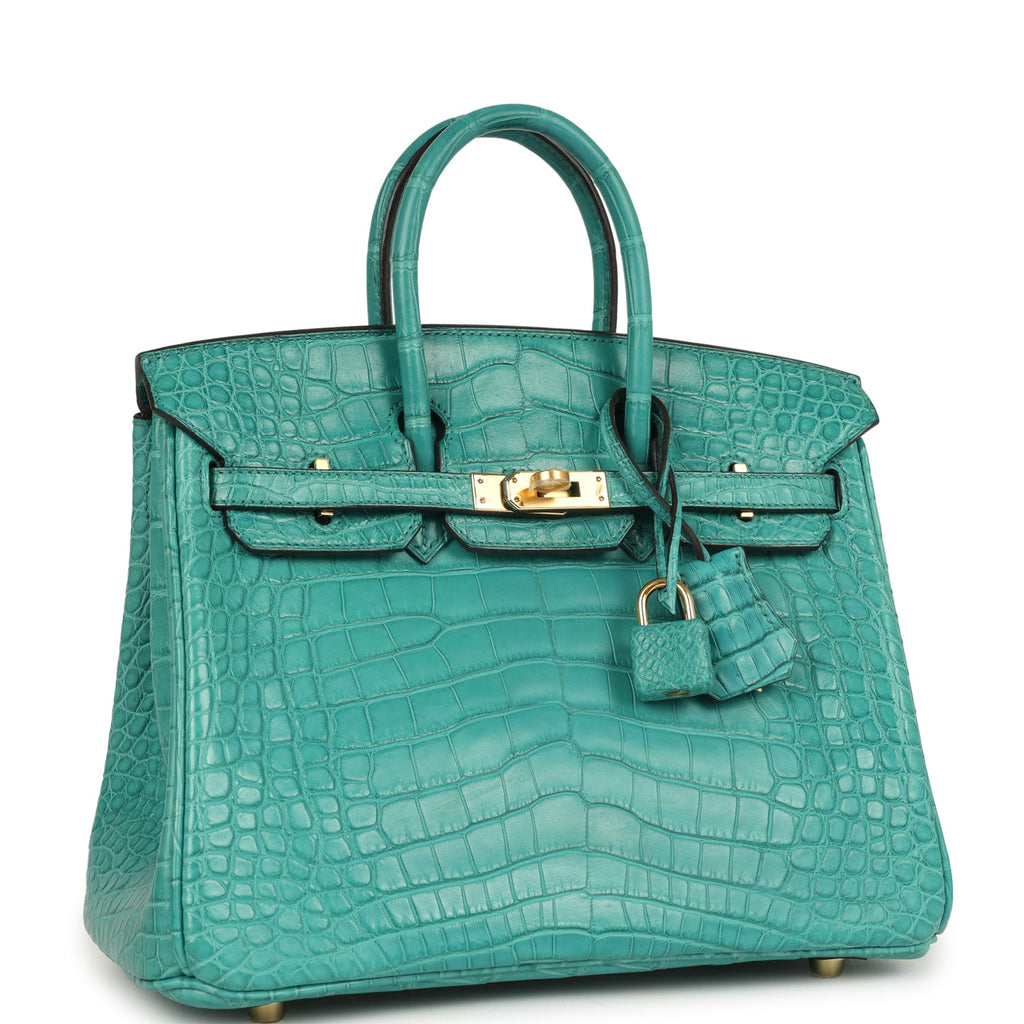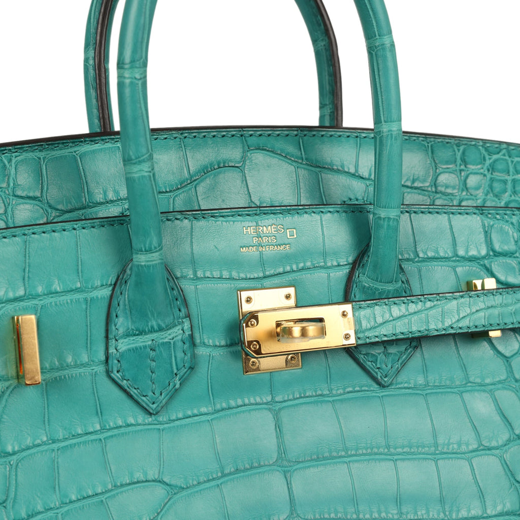 Hermes Birkin 25 Bleu Paon Matte Alligator Gold Hardware Shop for an authentic Hermes Birkin 25 in Bleu Paon Matte Mississippiensis Alligator with gold hardware in never worn condition at Madison Avenue Couture.