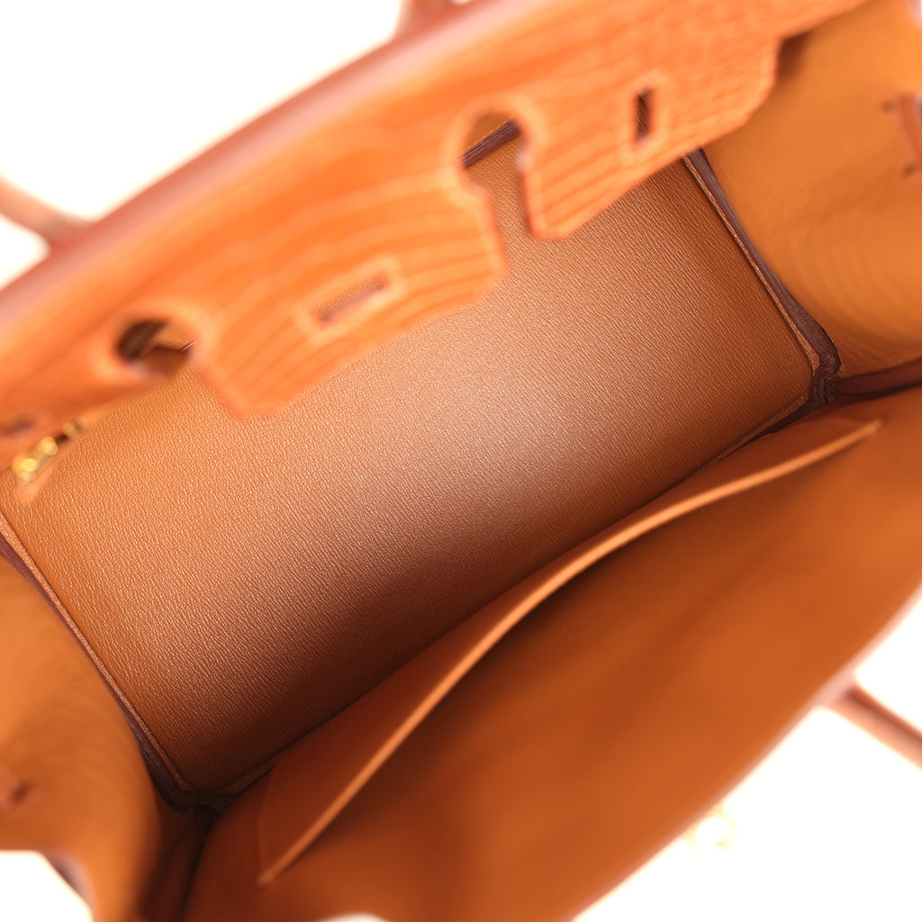 This Birkin is in Gold Matte Alligator Mississippiensis leather with gold hardware and has tonal stitching, front flap, two straps with center toggle closure, clochette with lock and two keys, and double rolled handles.The interior is lined with Gold chevre and has one zip pocket with an Hermès engraved zipper pull and an open pocket on the opposite side.Collection: K (2025)Origin: FranceCondition: New and never worn (Plastic on hardware)Accompanied by: Hermes box, Hermes dustbag, clochette, lock, two keys, clochette dustbag, CITES, carebook, ribbon and feltMeasurements: 10″ width x 7.5″ height x 4.75″ depth; 2.75″ handle drop