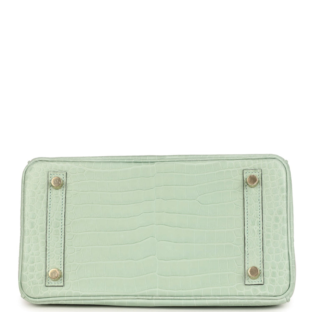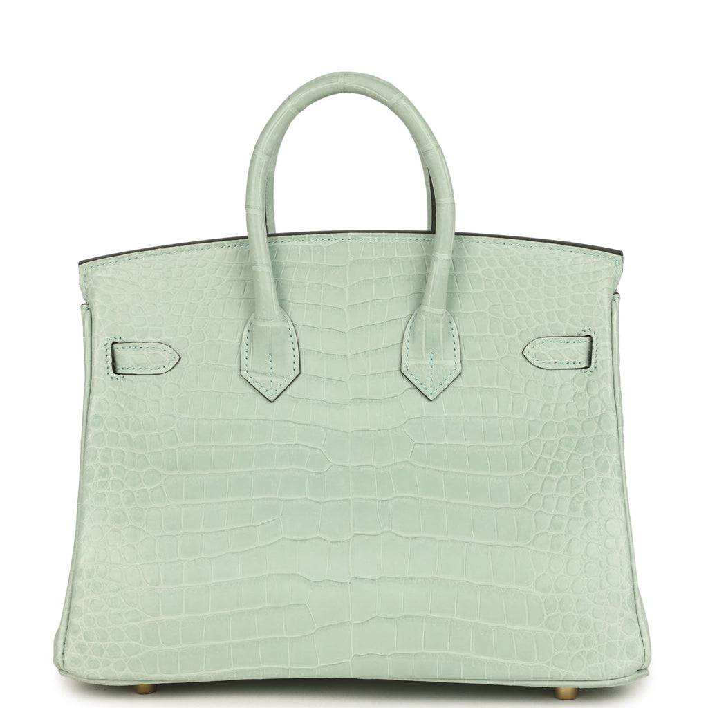 Hermes Birkin 25 Vert D'Eau Matte Porosus Crocodile Gold Hardware Shop for an authentic Hermes Birkin 25 in Vert D'Eau Matte Porosus Crocodile with gold hardware in new and never worn condition at Madison Avenue Couture.