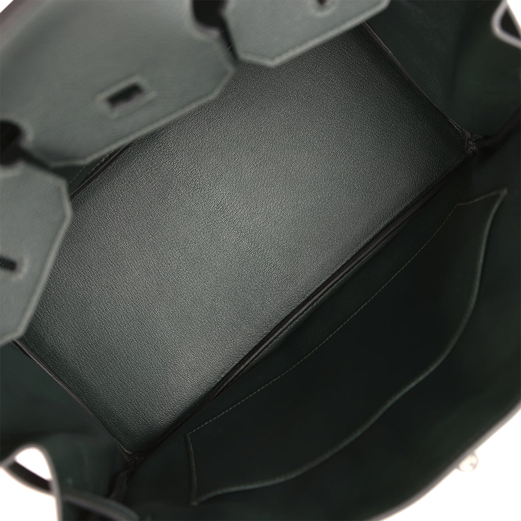 This Birkin is in New Vert Fonce togo leather with palladium hardware and has tonal stitching, front flap, two straps with center toggle closure, clochette with lock and two keys, and double rolled handles.The interior is lined with New Vert Fonce chevre leather and has one zip pocket with an Hermes engraved zipper pull and an open pocket on the opposite side.Collection: W (2024)Origin: FranceCondition: New and never worn (plastic on hardware)Accompanied by: Hermes box, Hermes dustbag, felt, clochette, lock, two keys, clochette dustbag, carebookMeasurements: 13.75″ width x 11″ height x 7″ depth; 4.25″ handle drop