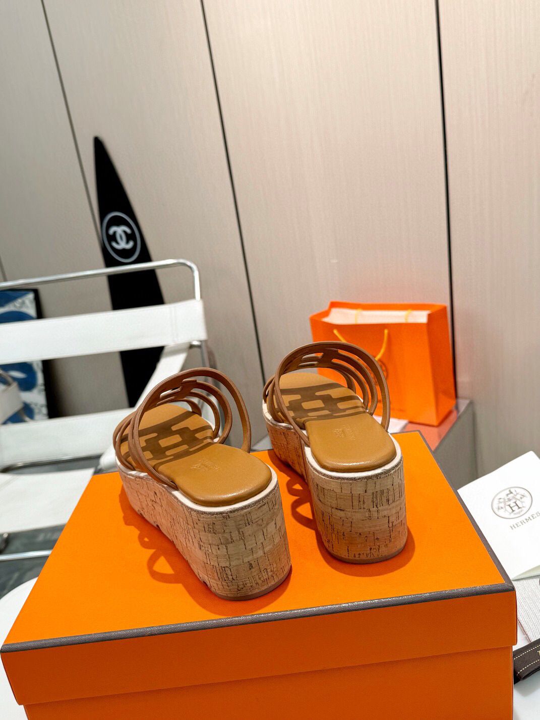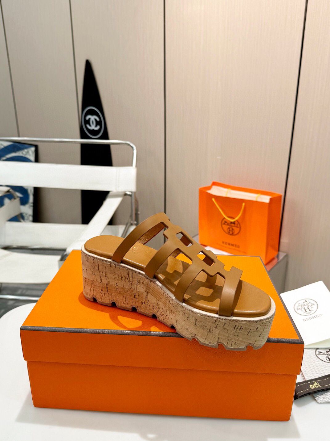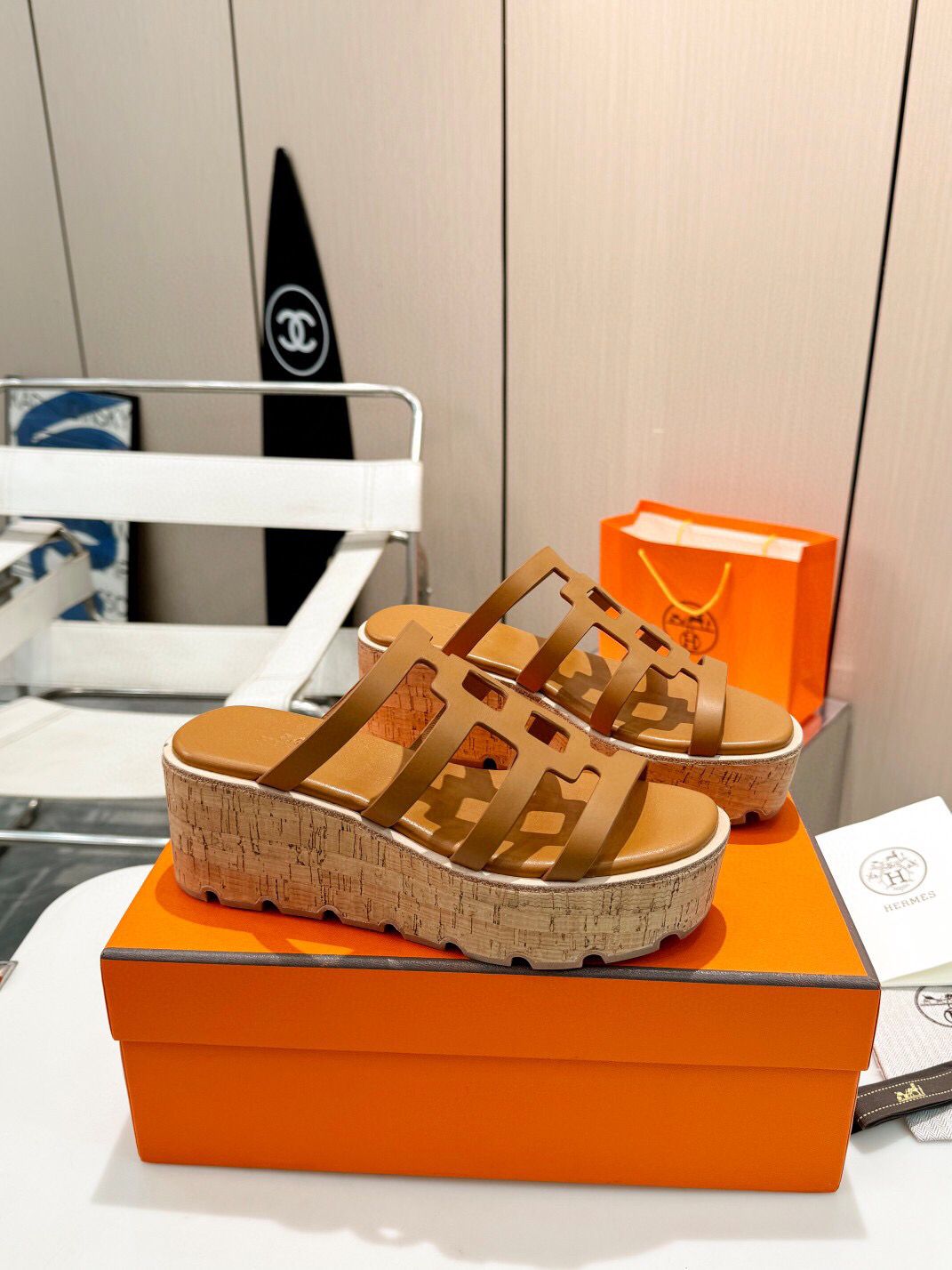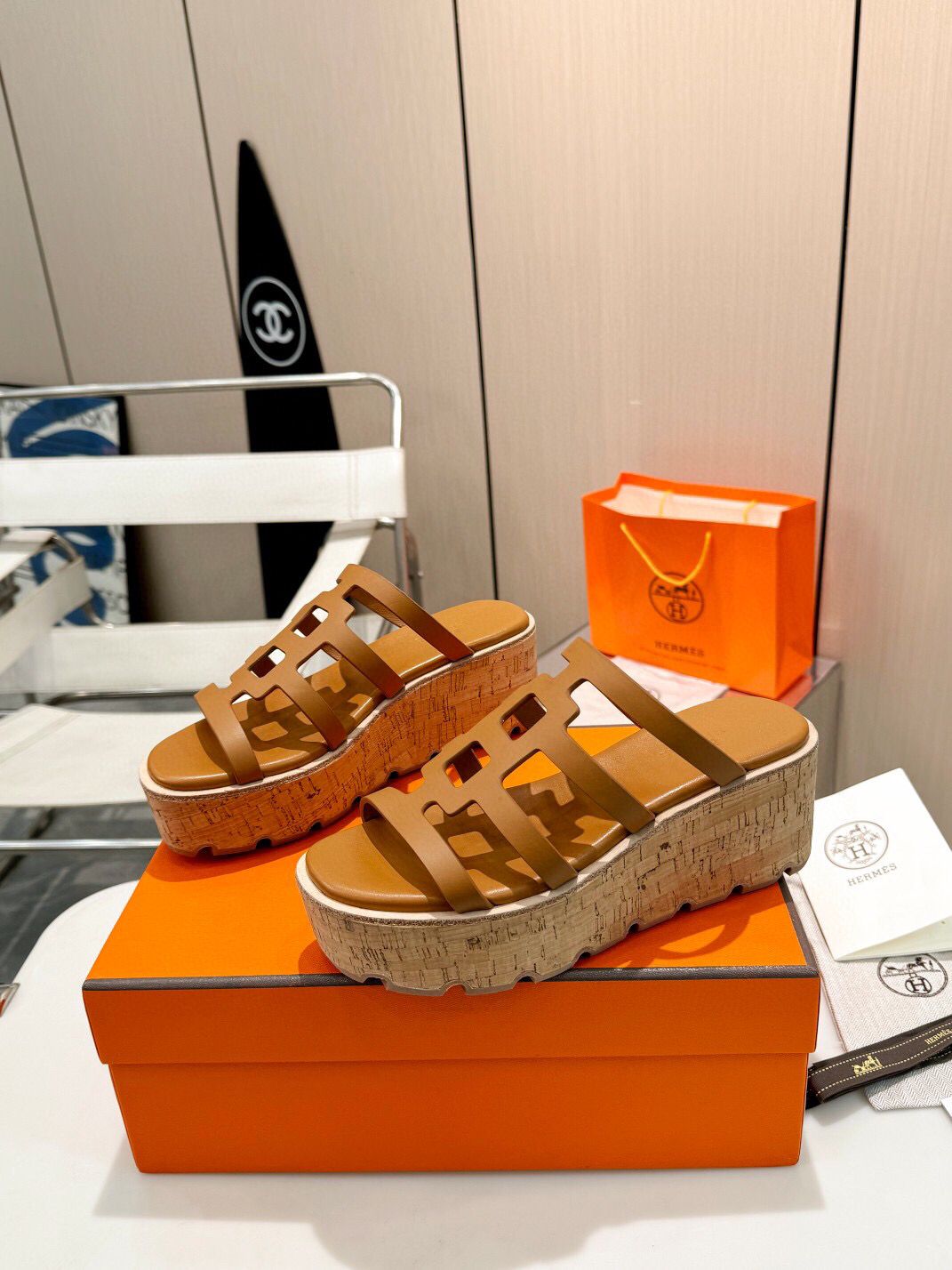 Cork platform for summer are what florals are to spring. Hermes Isabella 30 pair is crafted from smooth calfskin with contrasting edges and iconic “H” cut-out. They’ll go with everything from pareos to dresses to cropped jeans.