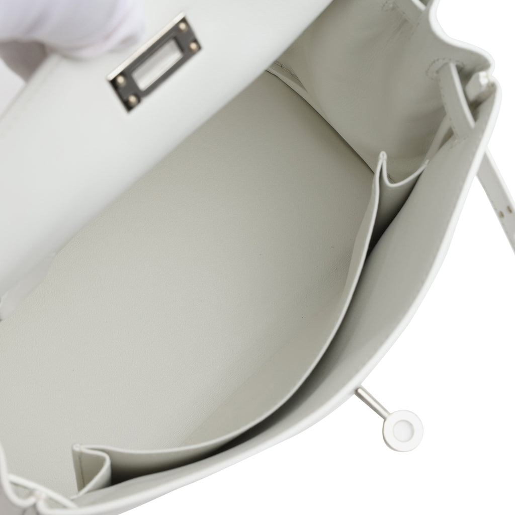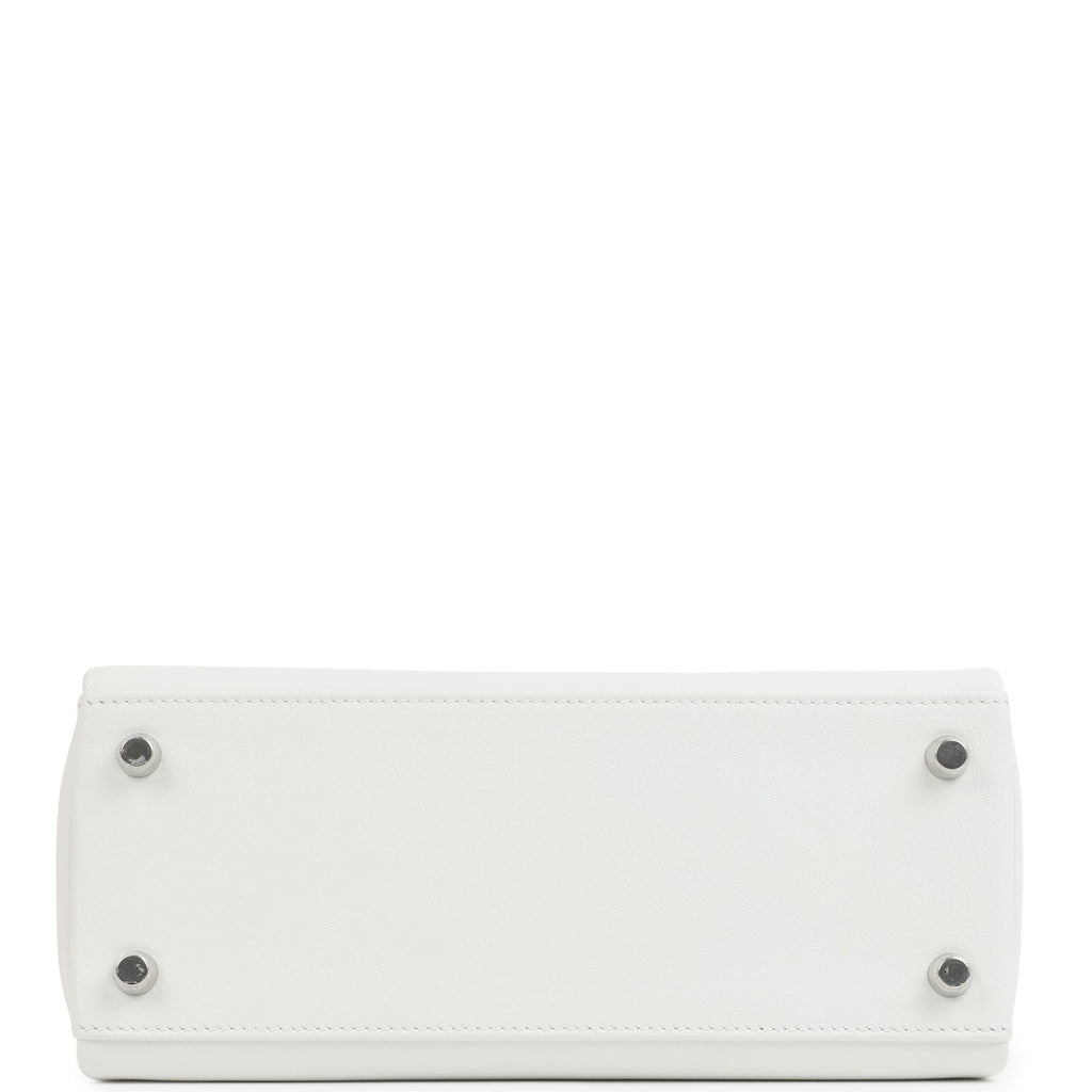 Hermes Kelly Retourne 25 New White Swift Palladium Hardware Shop for an authentic Hermes Kelly Retourne 25 in New White swift leather with palladium hardware in new and never worn condition at Madison Avenue Couture.