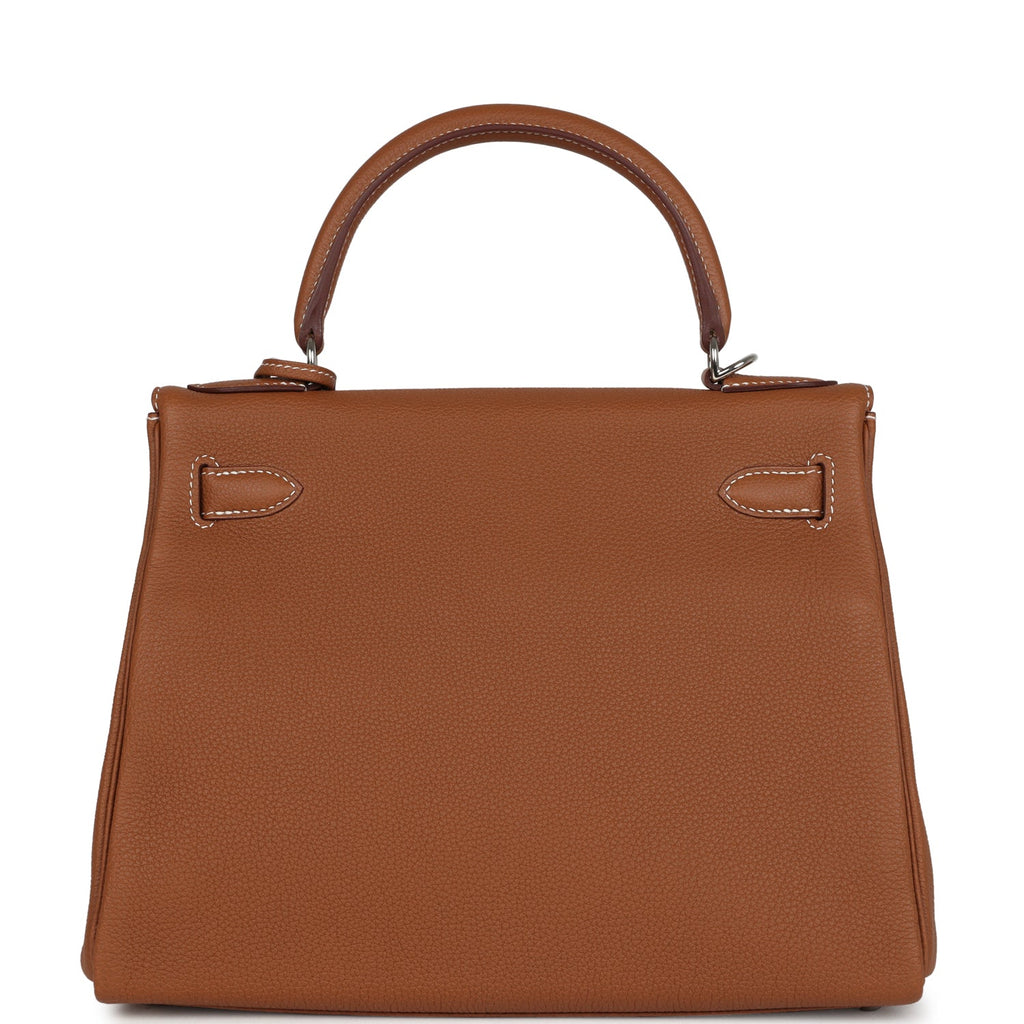 Hermes Kelly Retourne 28 Gold Togo Palladium Hardware Shop for an authentic Hermes Kelly Retourne 28 in Gold togo leather with palladium hardware in new and never worn condition at Madison Avenue Couture.