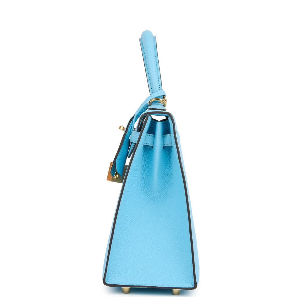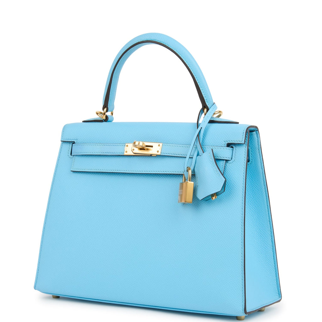 Hermes Kelly Sellier 25 Celeste Epsom Gold Hardware Shop for an authentic Hermes Kelly 25 in Bleu Celeste epsom leather with gold hardware in never worn condition at Madison Avenue Couture.