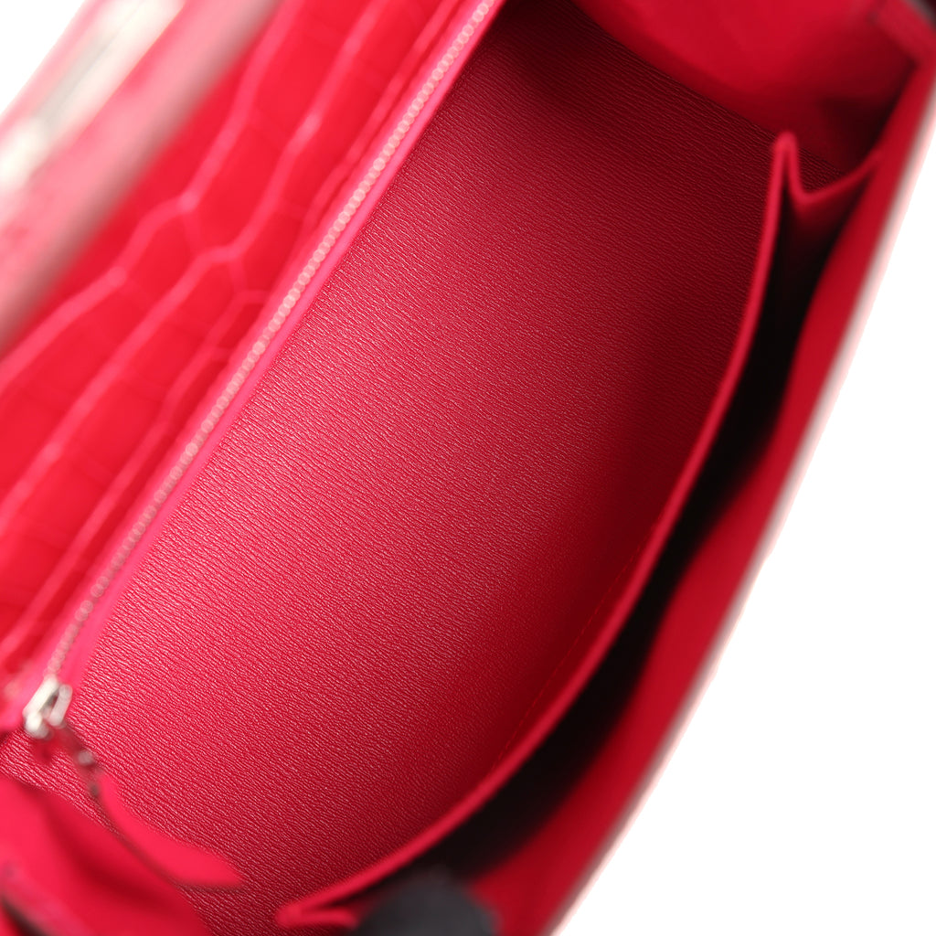 This Kelly, in the Sellier style, is Rose Extreme Shiny Alligator Mississippiensis leather with palladium hardware and has tonal stitching, front flap, two straps with center toggle closure, clochette with lock and two keys, single rolled handle and removable strap.The interior is lined with Rose Extreme chevre and has a zip pocket with an Hermes engraved zipper pull and two open pockets on the opposite side.Collection: B (2023)Origin: FranceCondition: New and never worn (plastic on hardware)Accompanied by: Hermes box, Hermes dustbag, clochette, lock, two keys, clochette dustbag, shoulder strap, shoulder strap dustbag, carebook, rainhat, CITES, feltMeasurements: 9.8″ width x 7″ height x 3.75″ depth; 3.75″ handle drop (16.5″ shoulder strap drop)