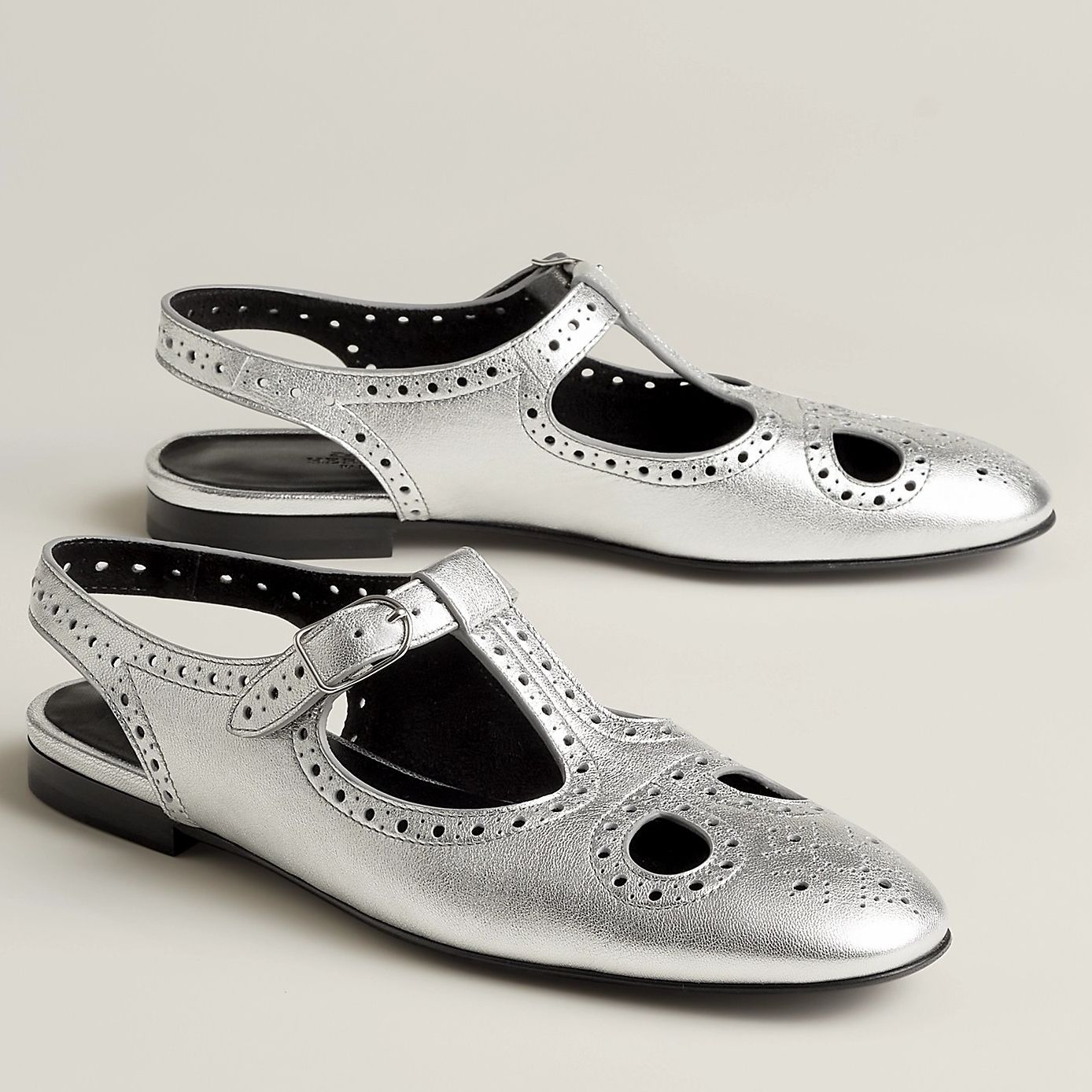 Hermes’s Kim slingback flats are the perfect way to toughen up a romantic dress. Crafted from metallic leather with perforations, they have palladium-plated buckles and sleek round toes for a modern and feminine look.