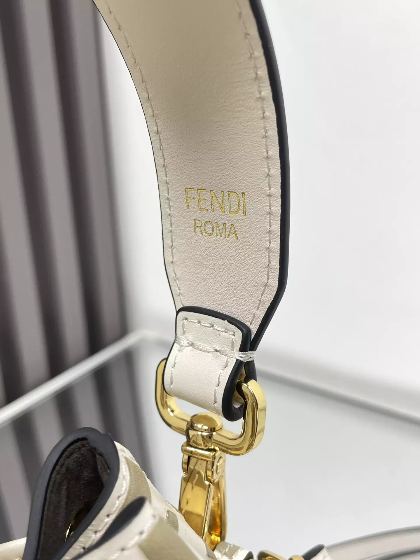 The bag is made of beige calf leather with the iconic embossed and hand-painted black FF motif. The metal details are finished in gold.
