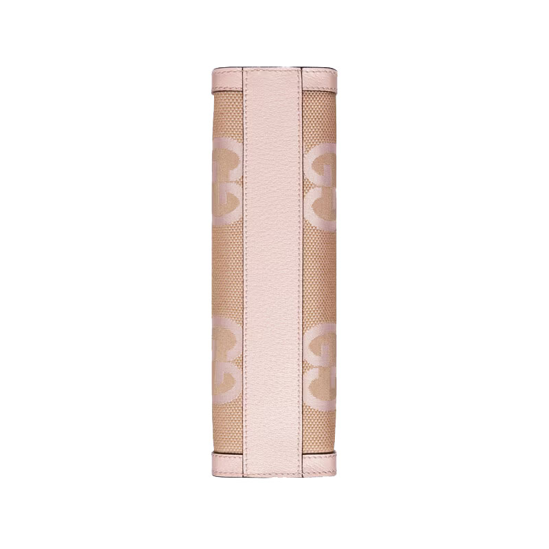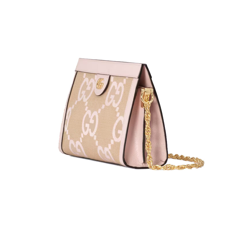 A jumbo GG canvas is used to create a new design by animating a small shoulder bag with a camel and light pink canvas base.