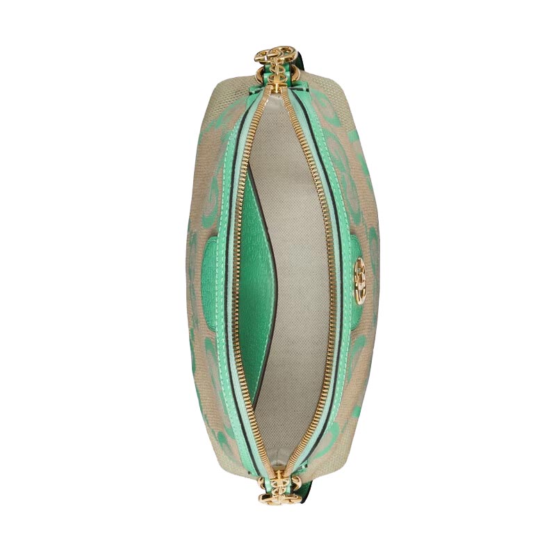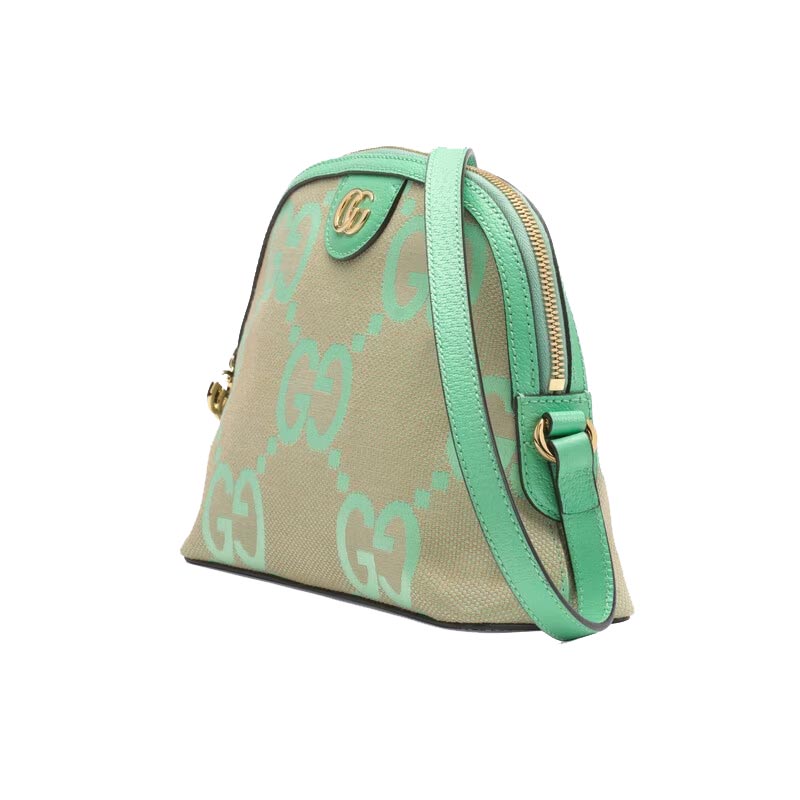 Exploring a new maximalist version of the historic monogram, the jumbo GG animates this small shoulder bag in camel and mint, creating striking look.