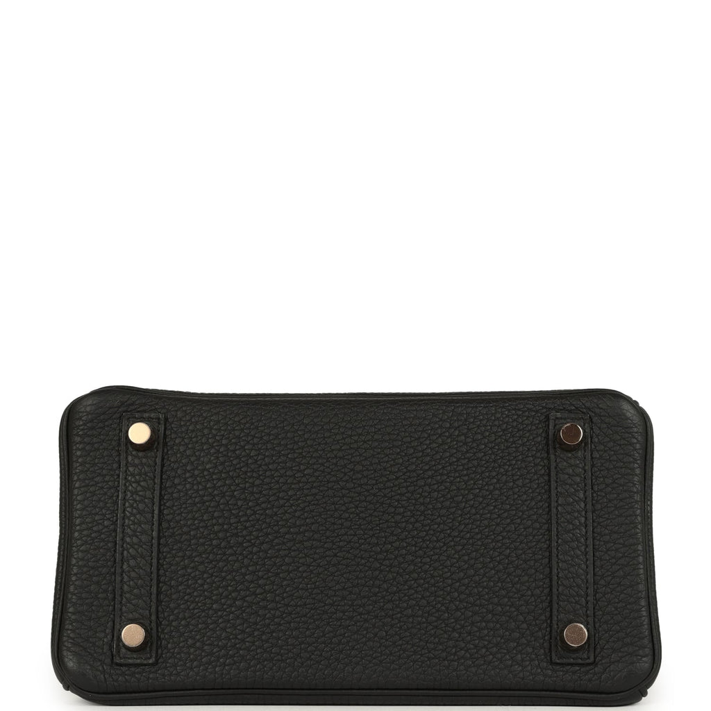 This Birkin is in Black togo leather with rose gold hardware, has tonal stitching, front flap, two straps with center toggle closure, clochette with lock and two keys, and double rolled handles.The interior is lined with Black chevre leather and has a zip pocket with an Hermes engraved zipper pull and an open pocket on the opposite side.Collection: D (2019) Origin: FranceCondition: Pre-owned; Mint – This bag retains its shape structure. There is partial plastic on the hardware. The exposed turnlock and one foot have some light scratching present. The exterior leather is clean with minimal signs of wear. The interior leather has a few faint press marks to the base but is otherwise clean.Accompanied by: Hermes box, Hermes dustbag, felt, clochette, lock, two keys, clochette dustbag, carebook, rainhatMeasurements: 10″ width x 7.5″ height x 4.75″ depth; 2.75″ handle drop