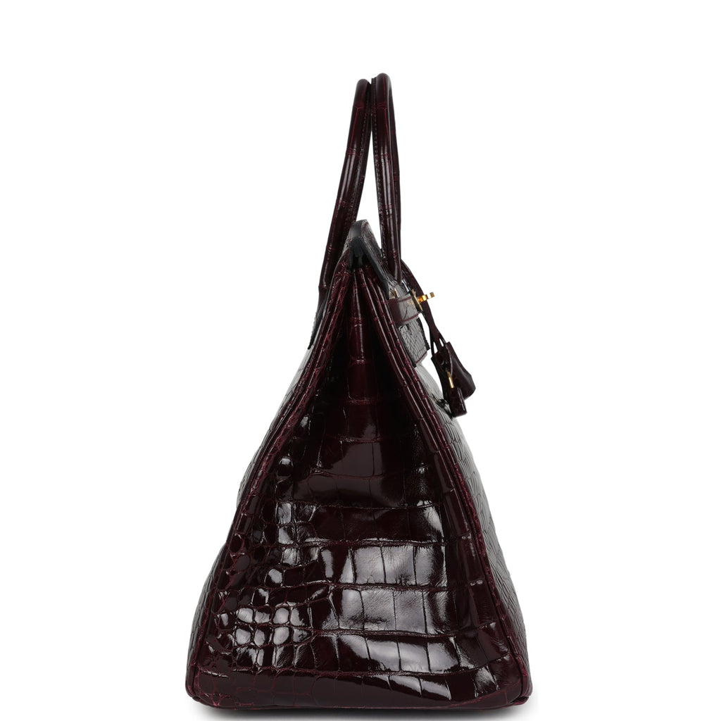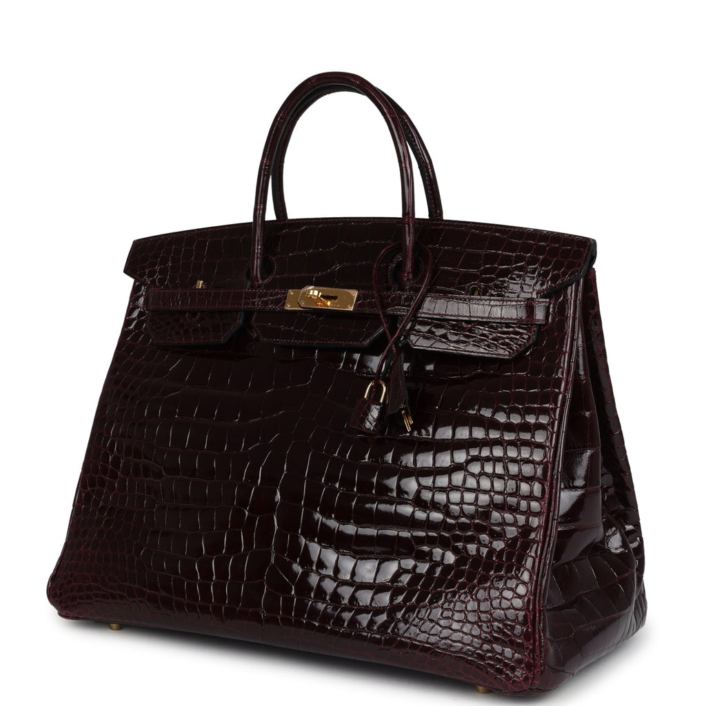Pre-owned Hermes Birkin 40 Bordeaux Shiny Porosus Crocodile Gold Hardware Shop for an authentic pre-owned Hermes Birkin 40 in Bordeaux Shiny Porosus Crocodile with gold hardware in excellent to mint condition at Madison Avenue Couture.