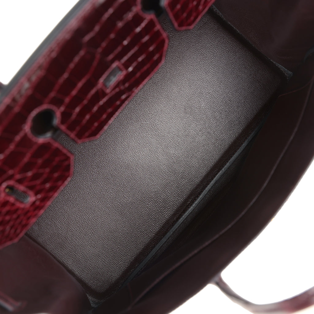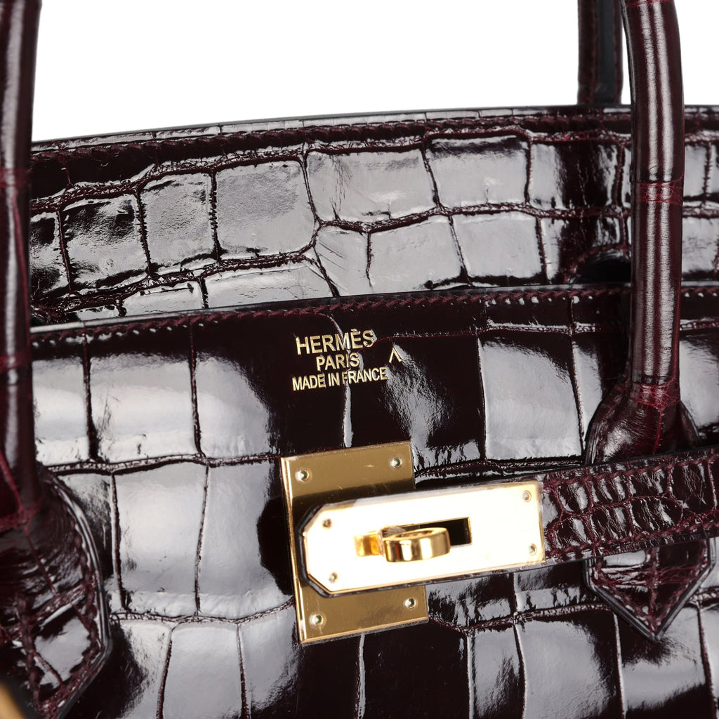 This Birkin is in Birkin is in Bordeaux shiny Porosus Crocodile with gold hardware and has tonal stitching, two straps with front toggle closure, clochette with lock and two keys and double rolled handles.The interior is lined in Bordeaux chevre with one zip pocket with an Hermes engraved zipper pull and an open pocket on the opposite side.Collection: T (2015)Origin: FranceCondition: Pre-owned; Excellent to Mint – This bag is slightly relaxed in its shape. There is plastic on all the hardware except for the turnlock and feet, resulting in some hairline scratches to the feet and light scratches to the turnlock. The hardware rivets sealed under the plastic are have some tarnishing. The exterior leather has some light creasing all over. There are faint marks and matting to the front flap, lower front, back center, and base. The corners have some minor scuffing present. The interior leather is clean with minimal signs of wear.Accompanied by:  MAC dustbag, clochette, two keys, lock and clochette dustbagMeasurements: 15.75″ width x 12.75″ height x 8″ depth; 4.25″ handle drop
