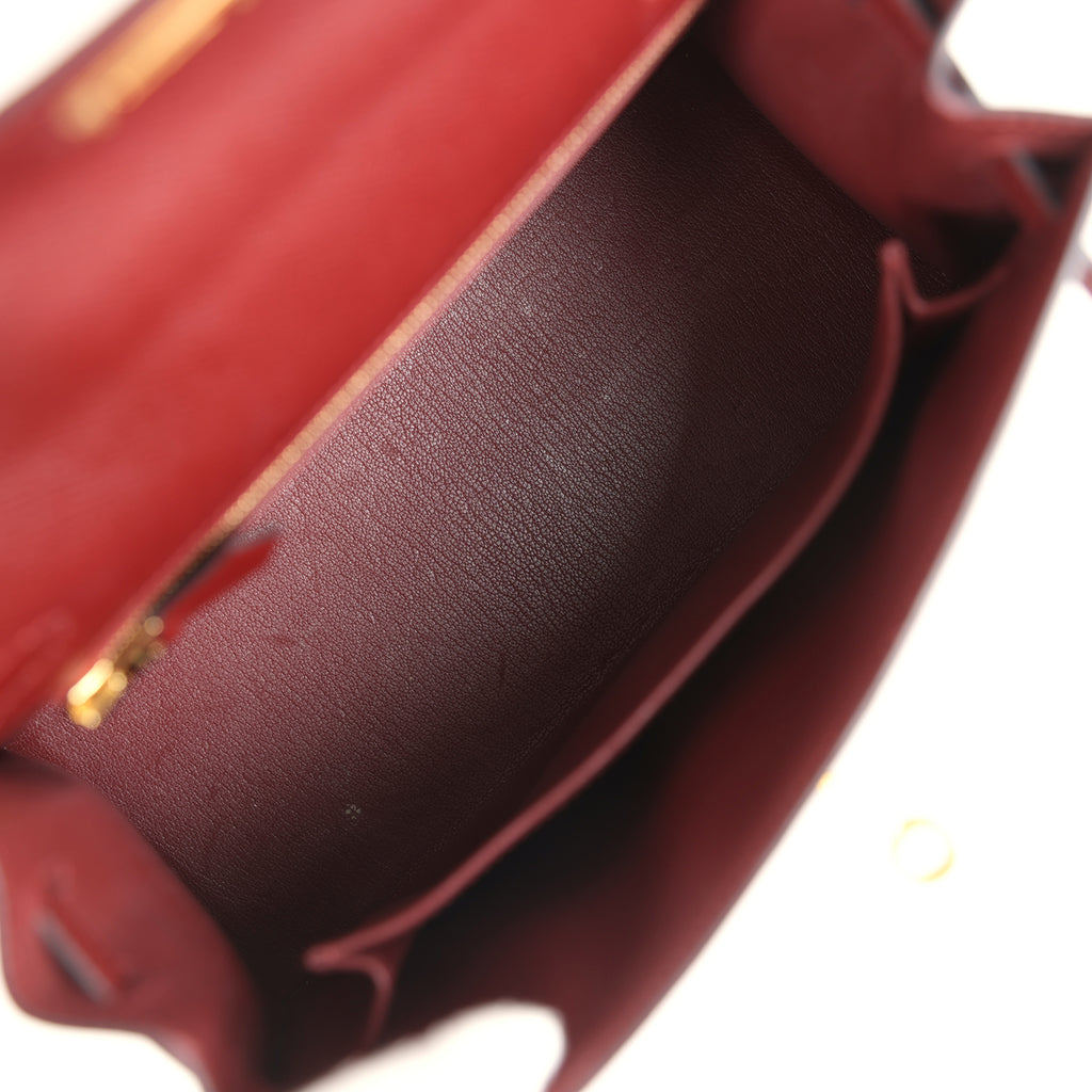This Kelly, in the Sellier style, is in Rouge H epsom leather with gold hardware, tonal stitching, front flap with two straps, front toggle closure, a removable shoulder strap and single rolled handle.The interior is lined in Rouge H chevre leather has one zip pocket with an Hermes engraved pull and one open pocket on the opposite side.Collection: Z (2021)Origin: FranceCondition: Pre-owned; Excellent – This bag retains its shape structure. There is no plastic on the hardware. There are visible scratches to the exposed hardware. The shoulder strap hardware has no plastic and has noticeable scratches. The exterior leather is clean overall but there is a tiny scratch to the front of the bag near the bottom. There is a small scuff to the back exterior leather, and a very light scuff mark to the base. The interior leather has a small spot, scratches and press markings to the interior base.Accompanied by: Hermes box (pre-owned), Hermes dustbag, felt clochette, lock, two keys, clochette dustbag, shoulder strap, shoulder strap dustbag, carebook, rainhatMeasurements: 9.8″ width x 7″ height x 3.75″ depth; 3.75″ handle drop (16.5″ shoulder strap drop)