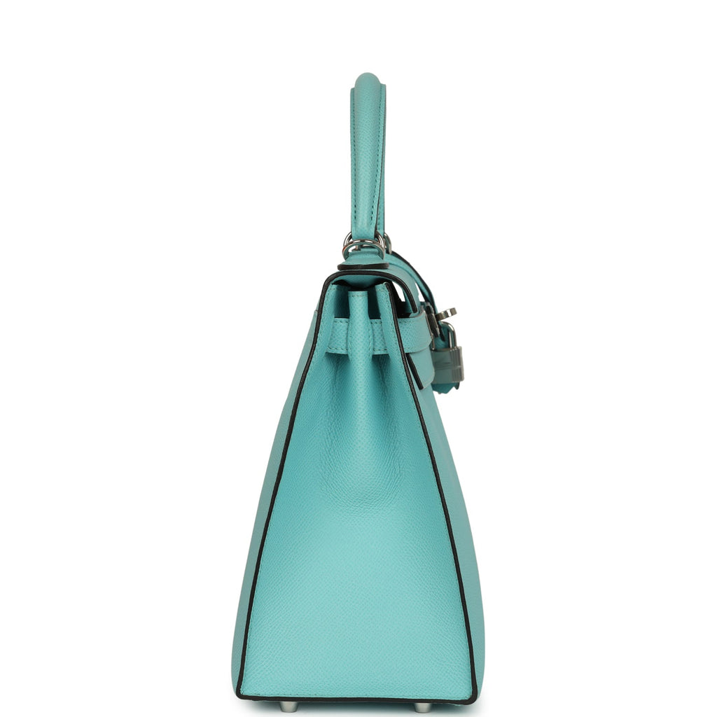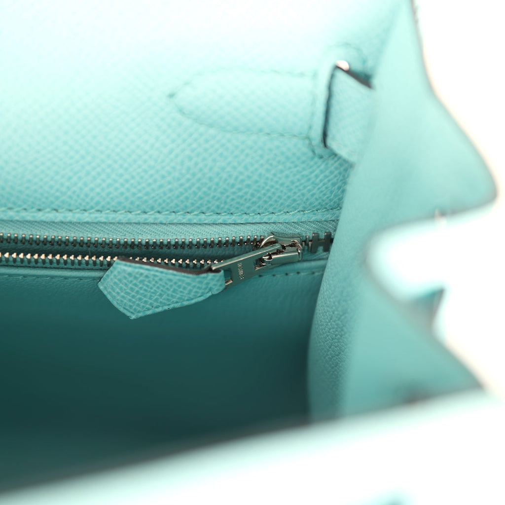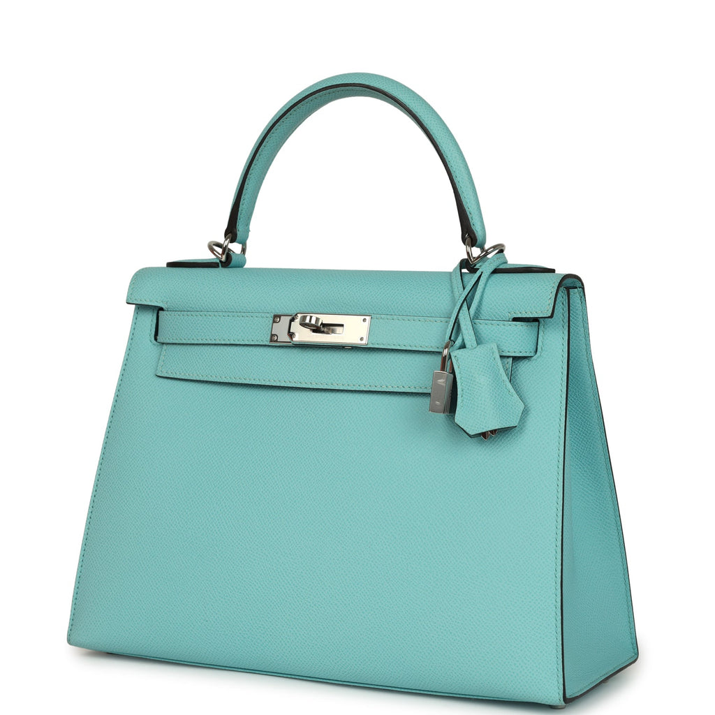 Pre-owned Hermes Kelly Sellier 28 Bleu Atoll Epsom Palladium Hardware Shop for an authentic pre-owned Hermes Kelly Sellier 28 in Bleu Atoll epsom leather with palladium hardware in excellent condition at Madison Avenue Couture.