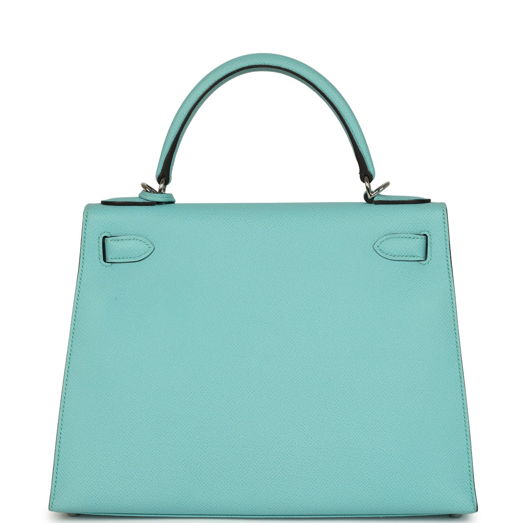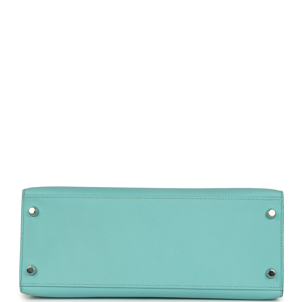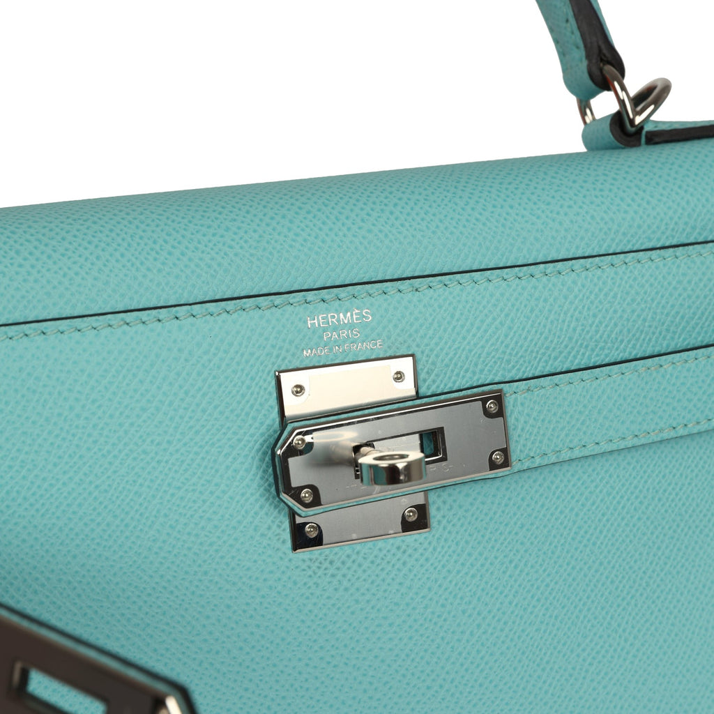 Pre-owned Hermes Kelly Sellier 28 Bleu Atoll Epsom Palladium Hardware Shop for an authentic pre-owned Hermes Kelly Sellier 28 in Bleu Atoll epsom leather with palladium hardware in excellent condition at Madison Avenue Couture.